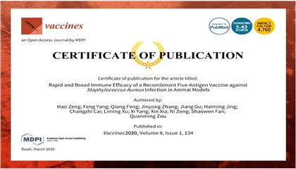 2020年3月18日,主要由樊绍文董事长带领的尊龙凯时生物科研团队及陆军军医大学邹全明教授带领的专家团队完成的论文《重组五价金黄色葡萄球菌疫苗在动物模型中的快速、广泛免疫效果研究》在多学科数字出版机构(MDPI)的《疫苗》(vaccines)期刊成功发表。